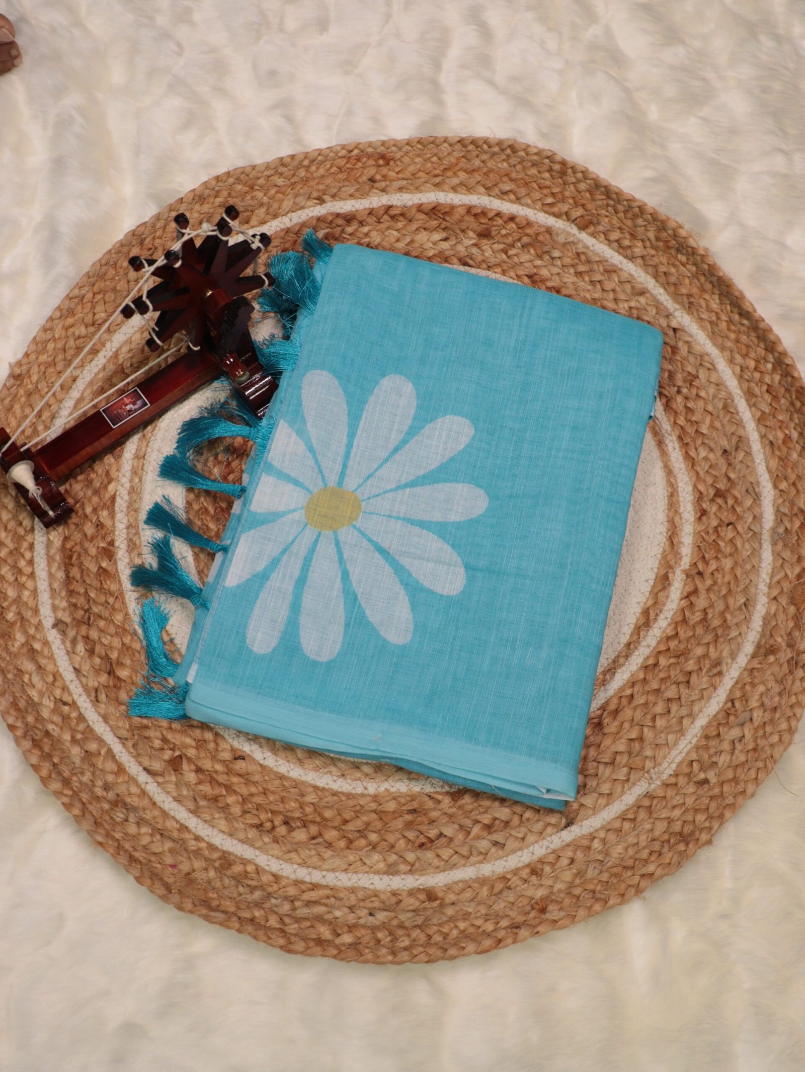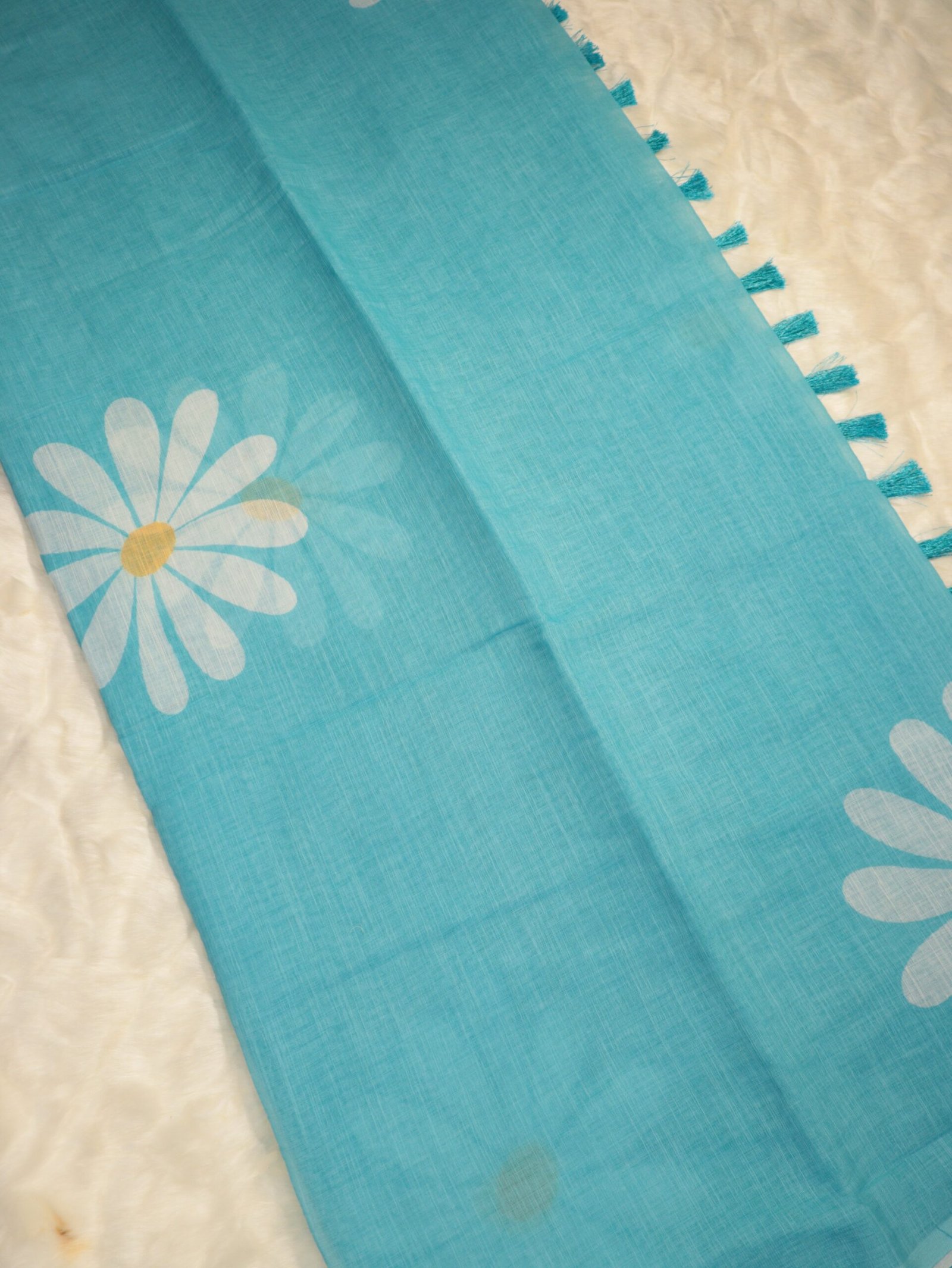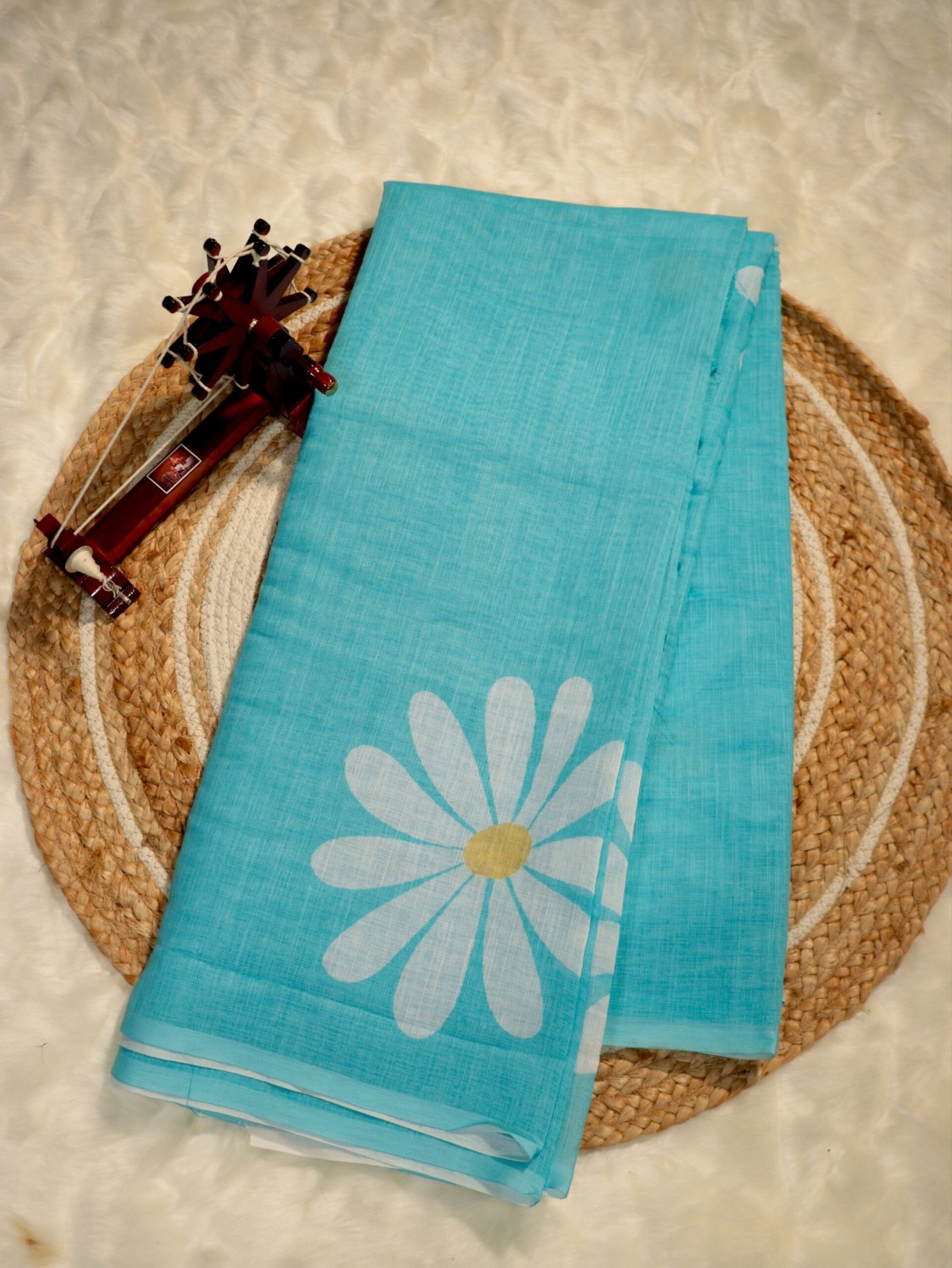 Aqua Blue Lenin Saree with Digital Floral Print – Elegant Casual & Brunch Wear