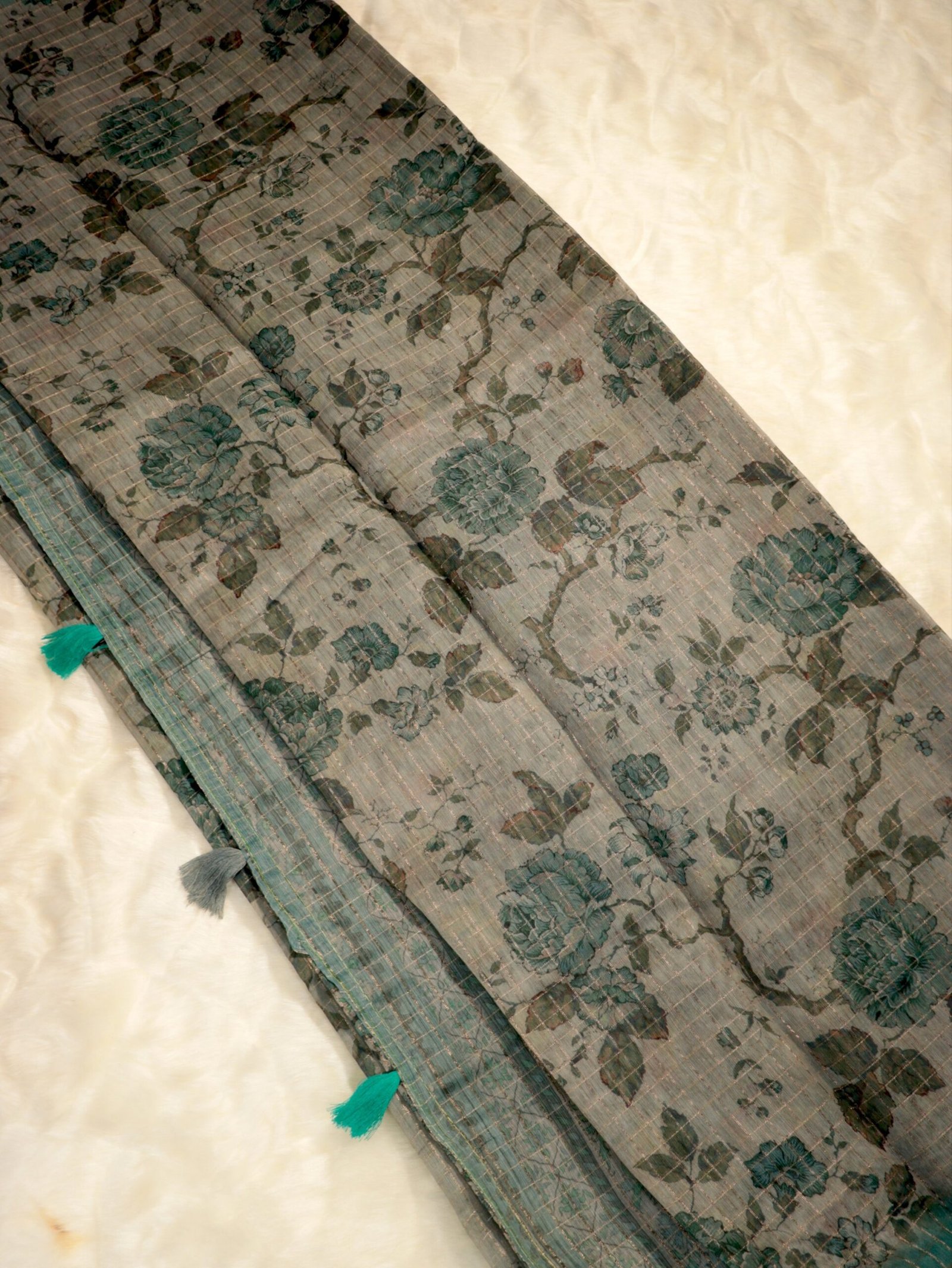Ash Grey Subtle printed saree featuring intricate motifs and fine texture with a refined finish for versatile wear