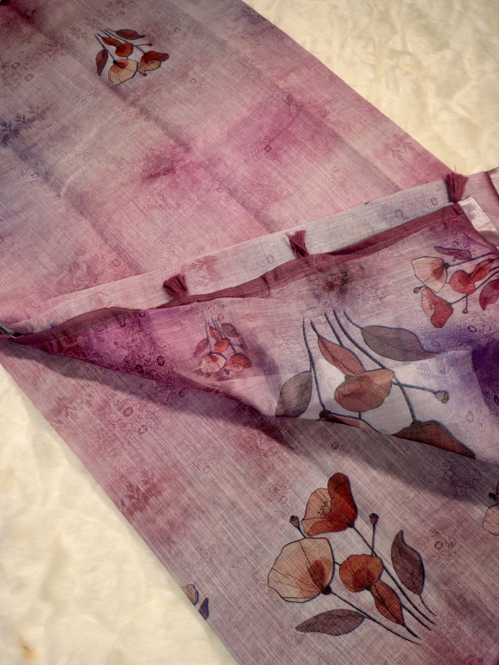 Elegant digital floral print inspired by soft botanical elements. Subtle watercolour-style finish across the body. Fine printed border with coordinated tassel detailing. Minimal yet artistic look that feels refined and contemporary. The lightweight fabric and airy weave make it extremely comfortable for long hours, while the soft neutral tone ensures effortless styling for workwear and casual outings.