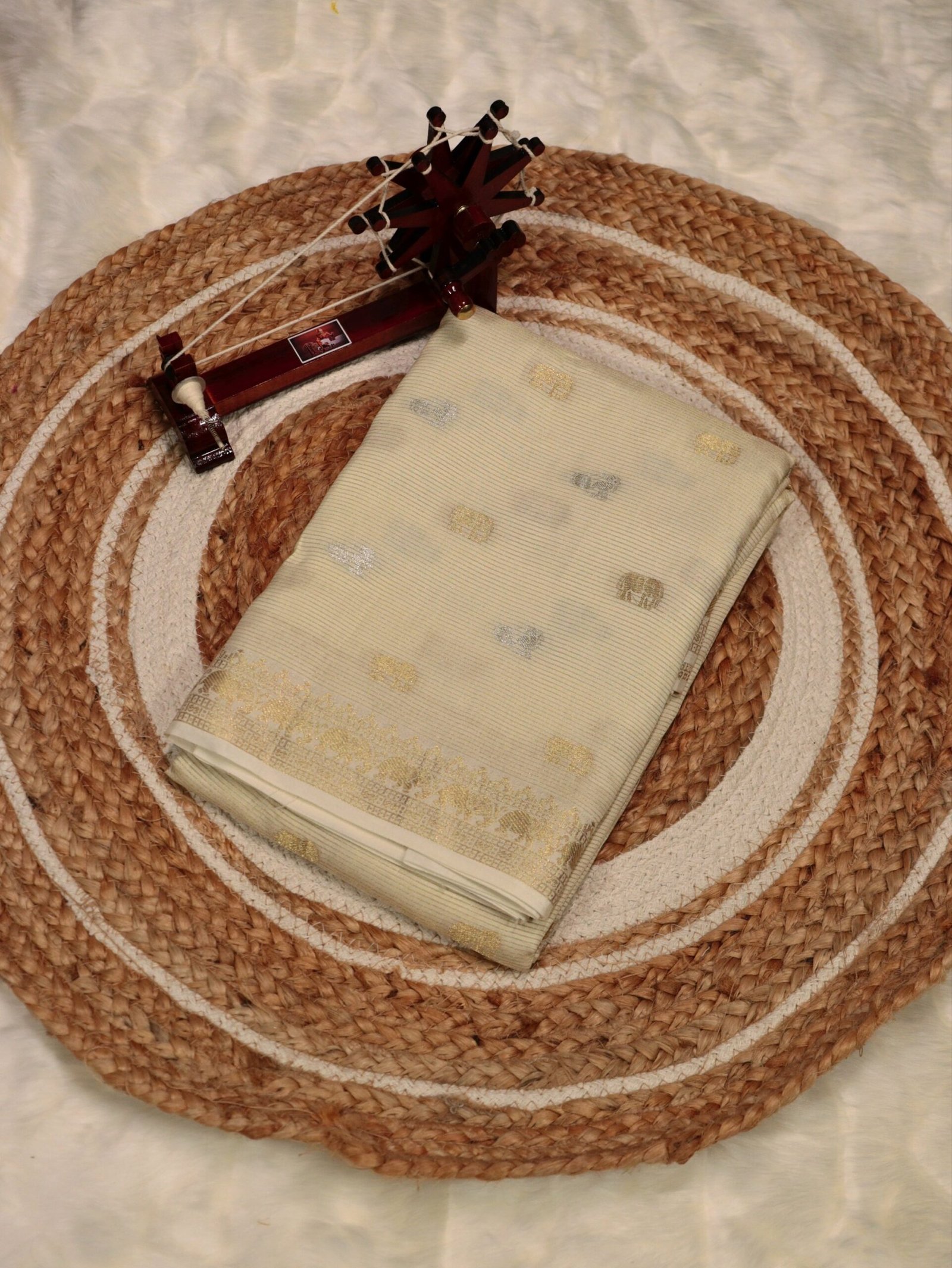Ivory Cream Dola Silk Saree with Gold-Silver Elephant, Peacock Motif- Premium Viscose Dola Silk with Contrast blouse