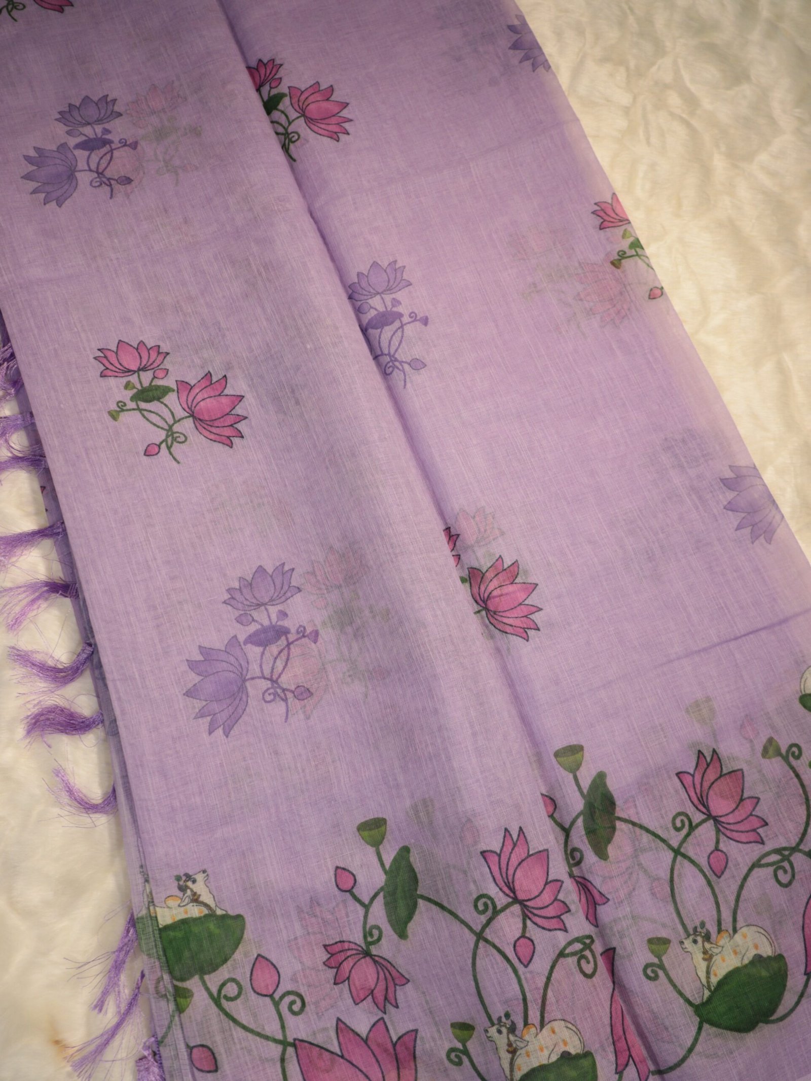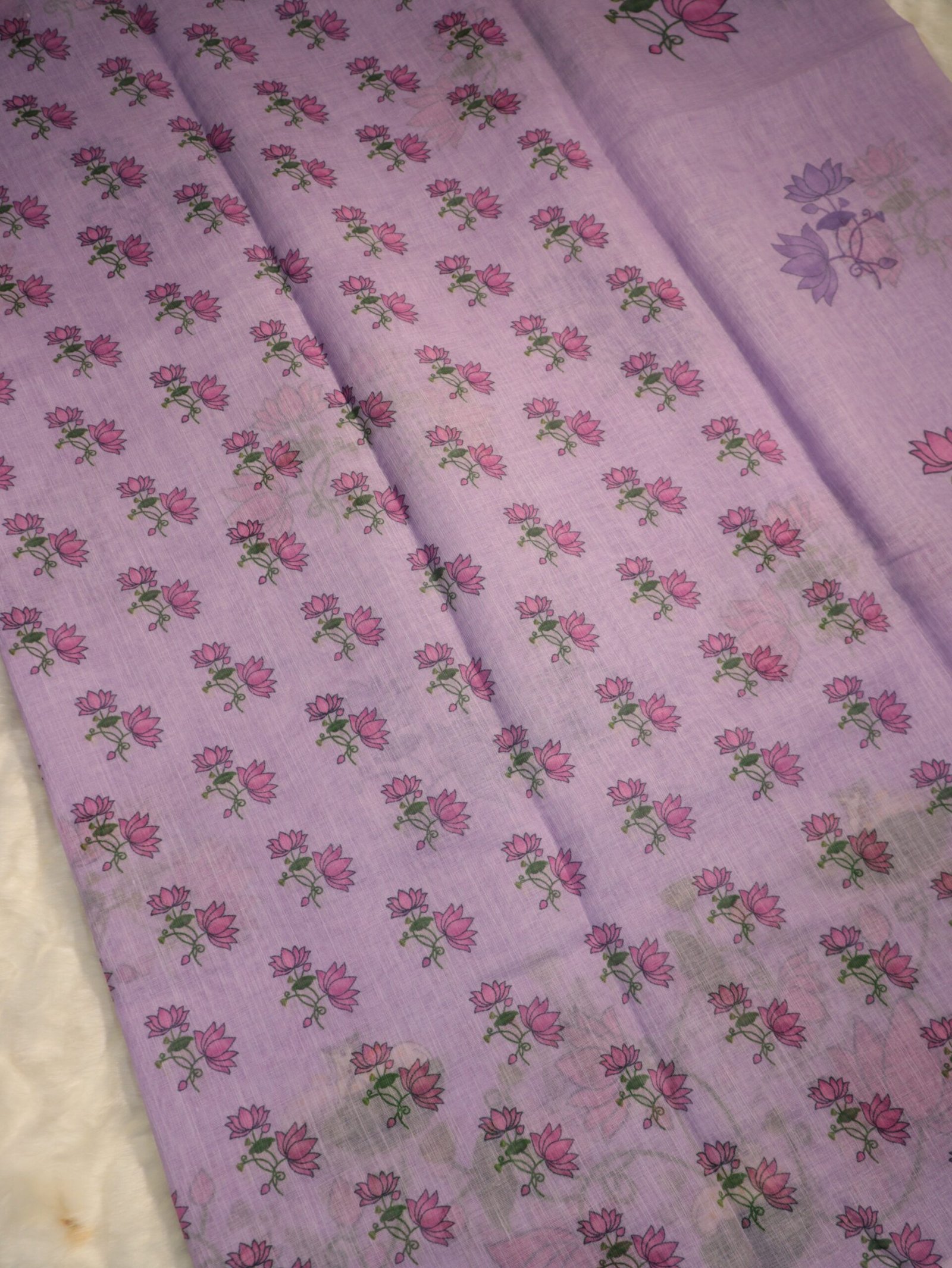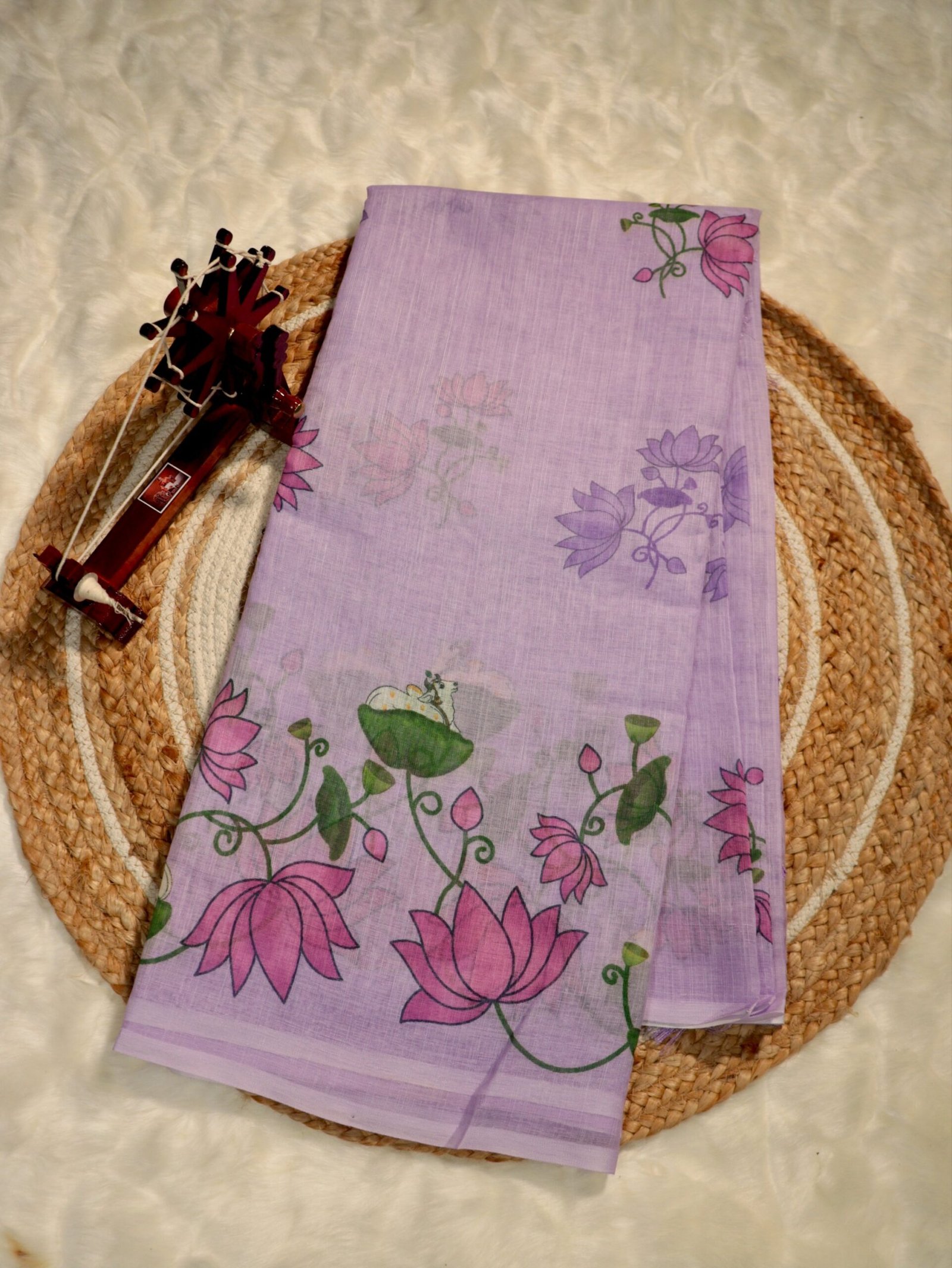Crafted in breathable Lenin fabric, this saree features delicate digital lotus prints inspired by traditional Pichwai art, giving it a soft artistic charm. The lightweight texture makes it easy to drape and carry, making it an ideal choice for brunch outings, casual meet-ups, office wear, and relaxed traditional occasions.