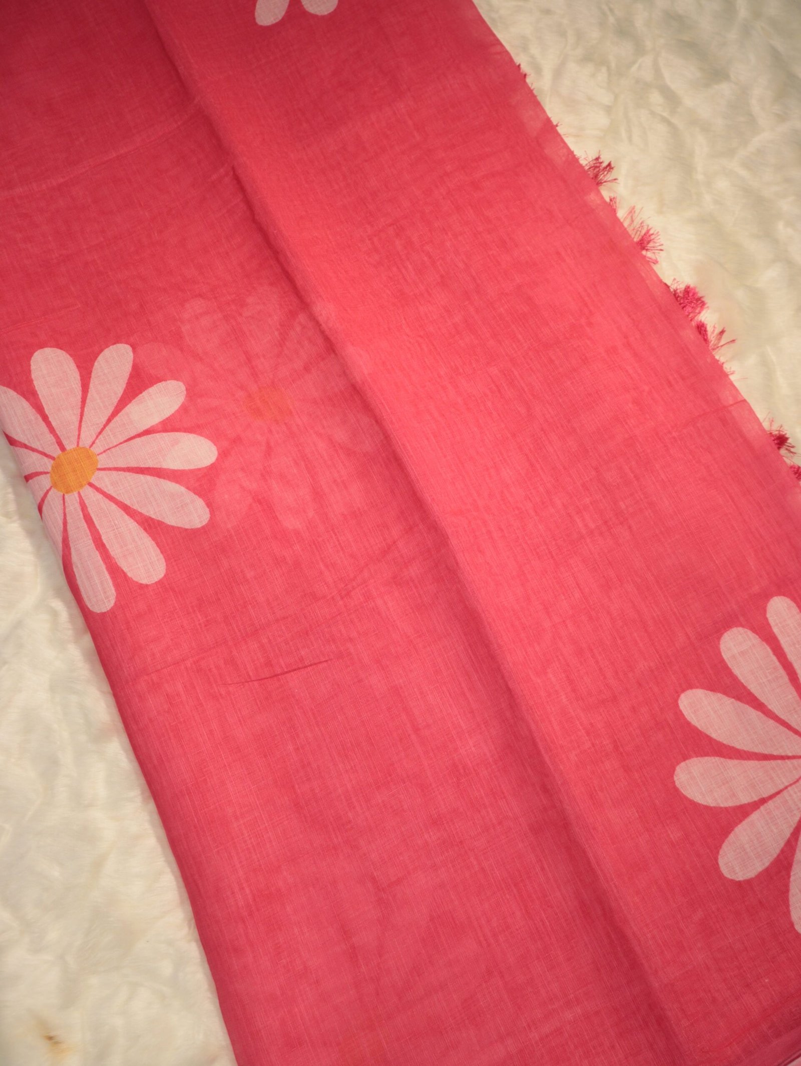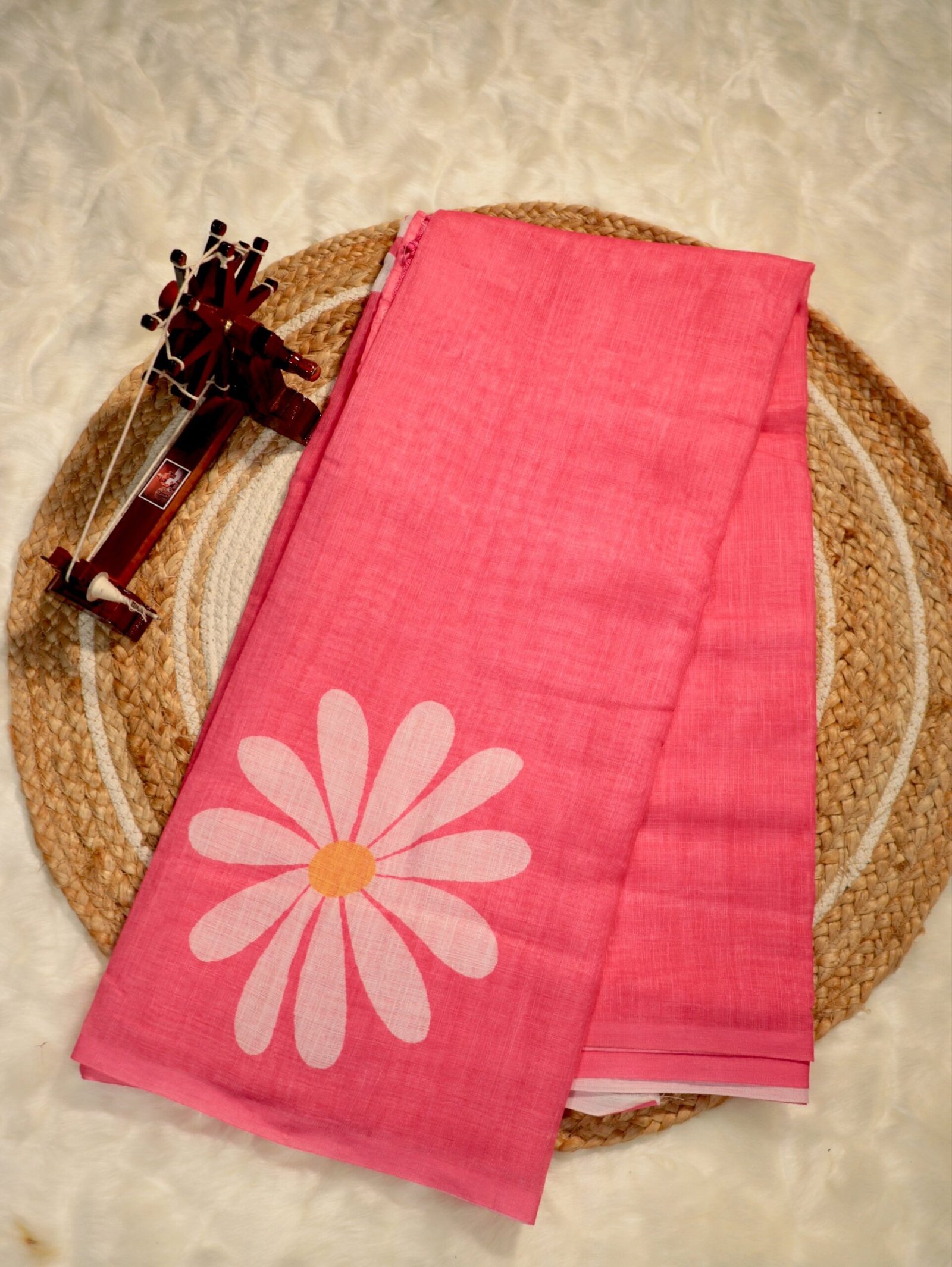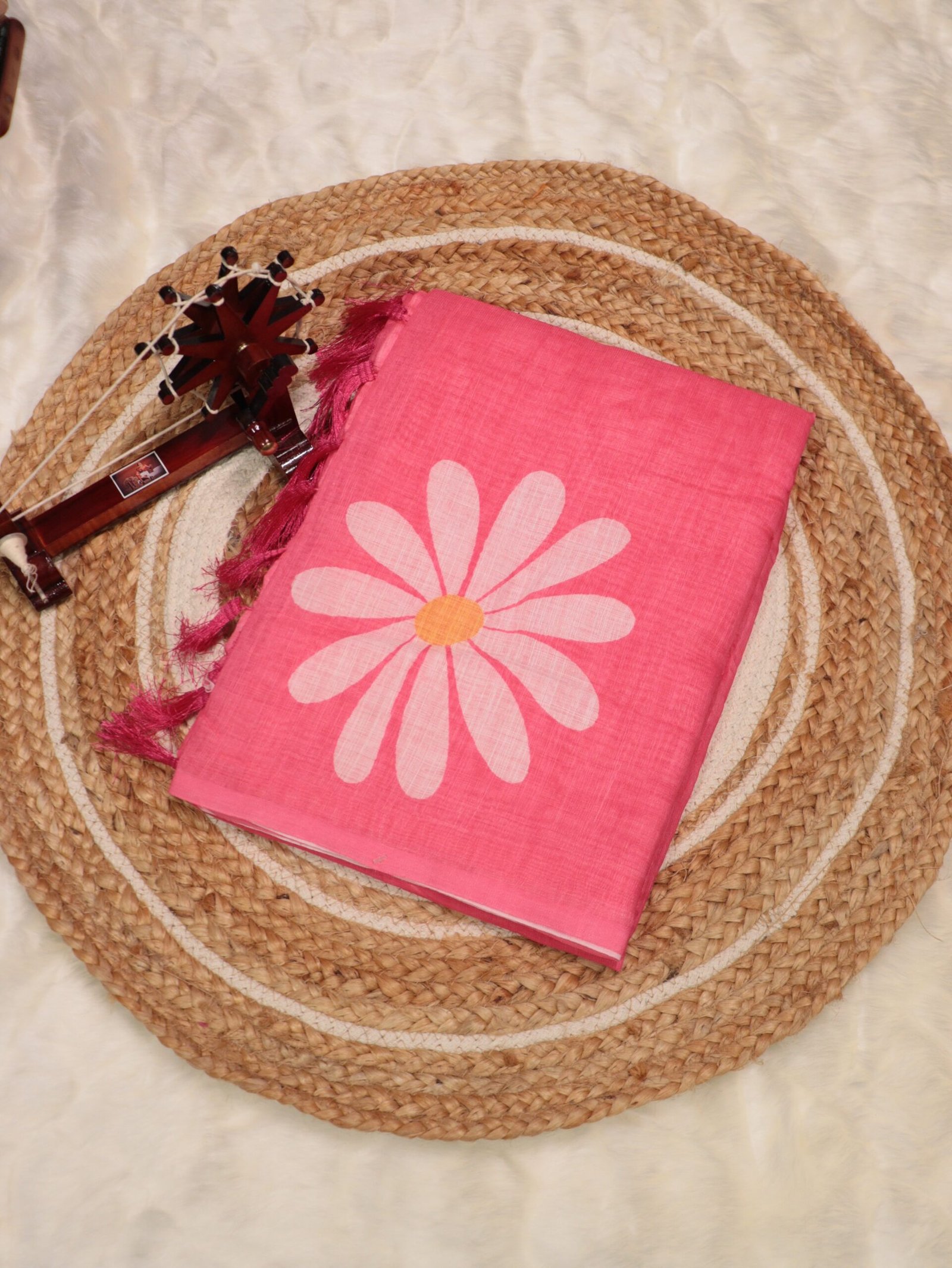 Rose Pink Lenin Saree with Digital Floral Print – Elegant Casual & Brunch Wear