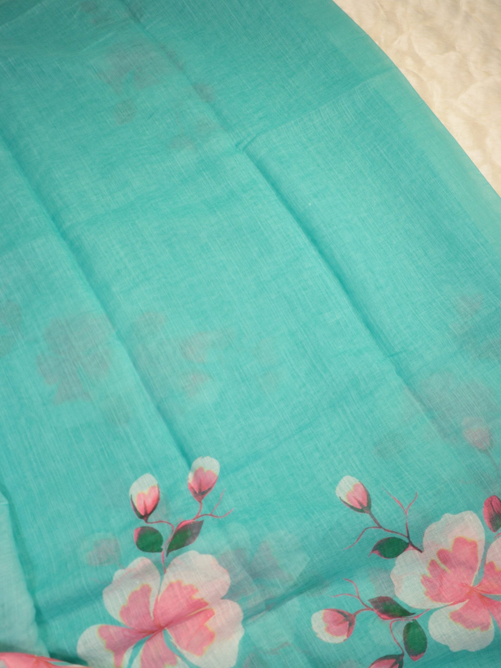 The saree features a delicate floral digital print placed gracefully along the lower border and pallu. The floral motifs, create a subtle contrast against the base, lending a calm and graceful charm. The rest of the body is kept plain, enhancing the elegance of the floral detailing. The lightweight texture makes it easy to drape and carry, making it an ideal choice for brunch outings, casual meet-ups, office wear, and relaxed traditional occasions.