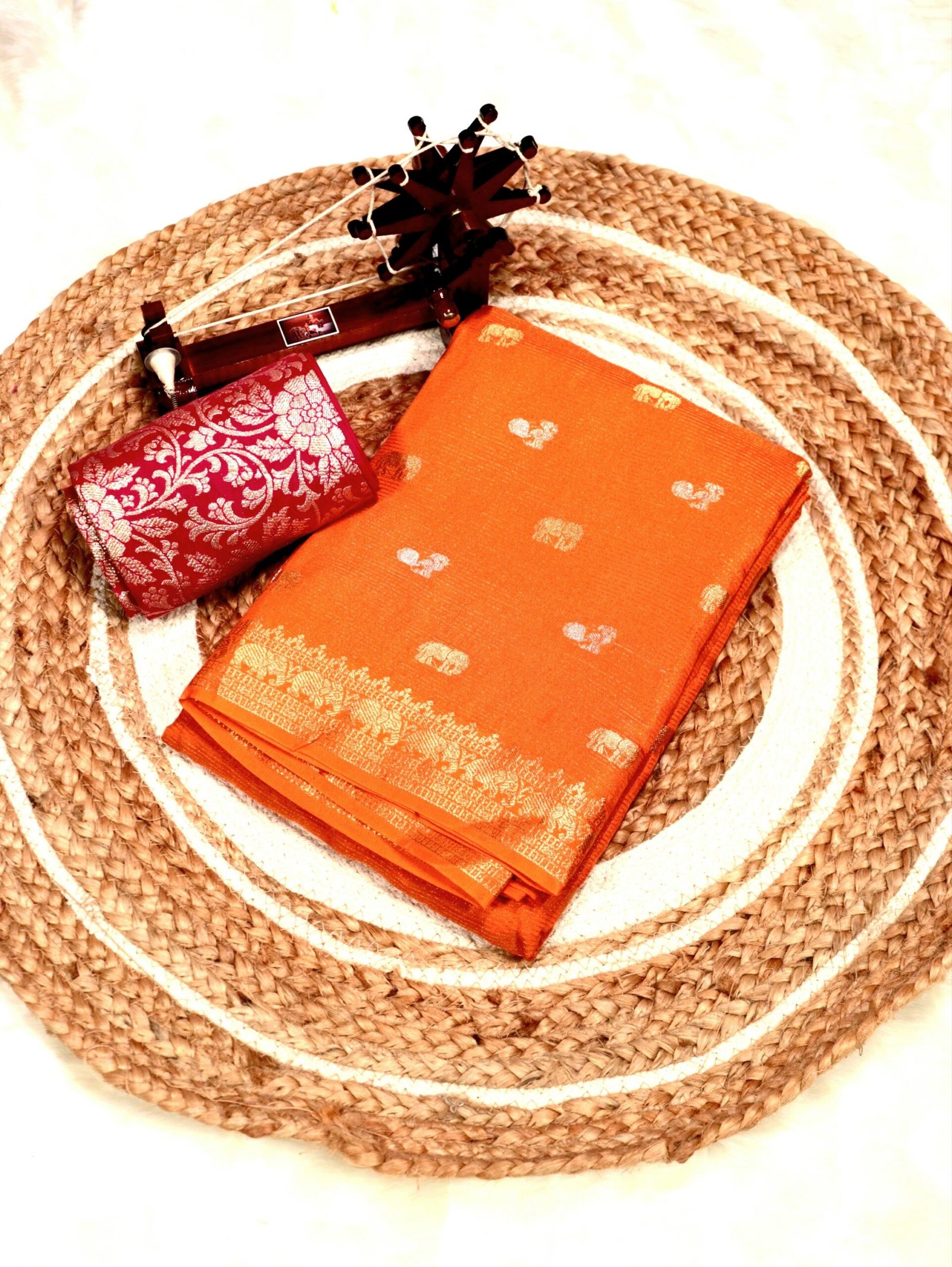 This saree features expertly woven gold zari throughout the border and body, paired with beautiful gold and silver elephant & peacock motifs that add a graceful, festive shimmer without overwhelming the design.